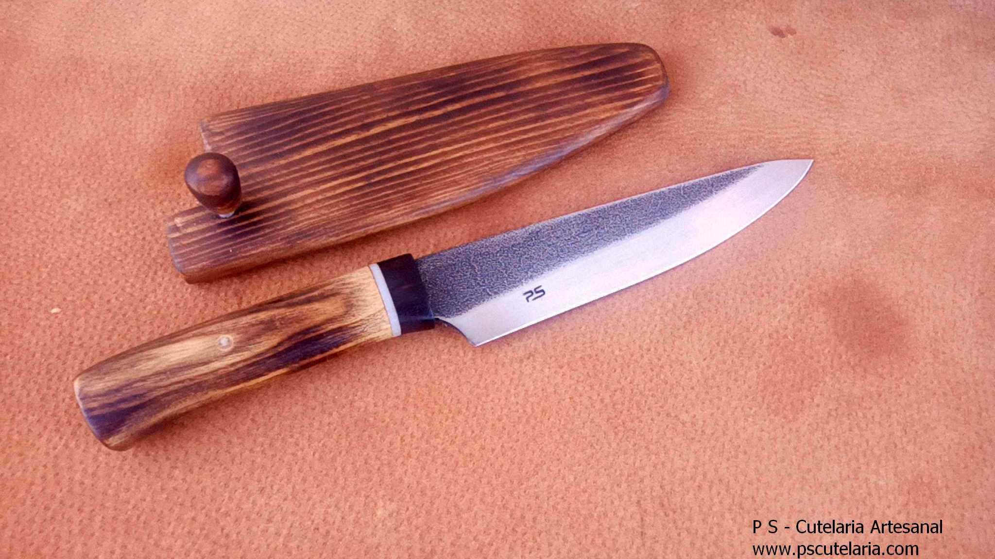 Aço Carbono K720 Cabo em Castanho / Pau-Santo Comprimento Total: 28 cm Comprimento da Lamina (até ao cabo): 16,7 cm Espessura da Lamina (junto ao cabo): 3 mm Largura da Lamina (junto ao cabo): 3,5 cm Bainha em Madeira